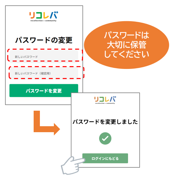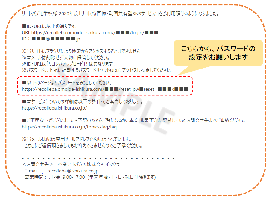 リコレバ 2024.04.23 2.パスワードの設定 [STEP1] admin@omoide-ishikura.comよりお届けしたメールに記載されているパスワード設定用URLよりサイトにアクセスしてください <メールサンプル画面> [STEP2] リンク先より、パスワードを設定してください