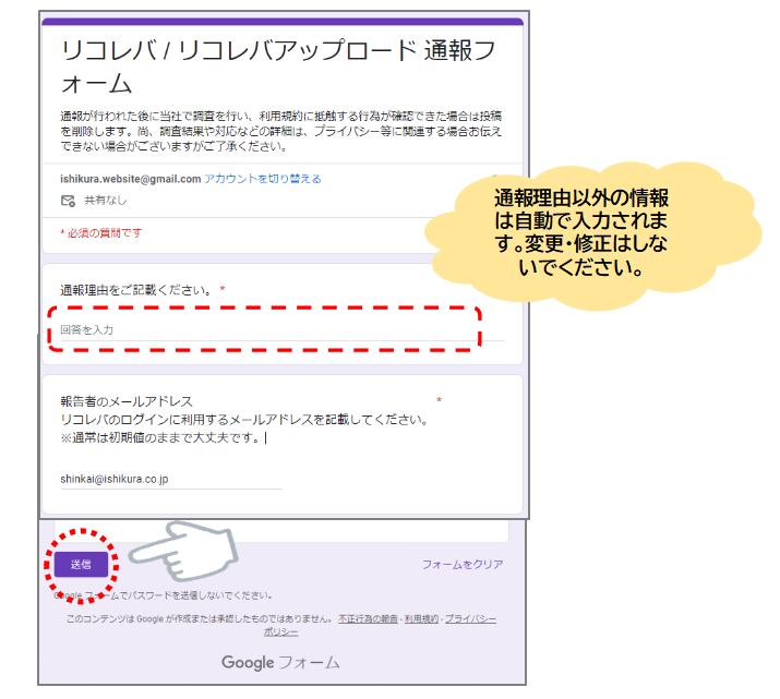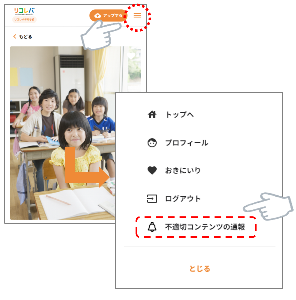 リコレバ 2024.04.23 8.不適切なコンテンツの通報 不適切なコンテンツ等がアップロードされていた場合は、通報機能から当社へご連絡ください 当社で通報内容を判断の上、削除等の適切な対応を行ないます [STEP1] 該当のカードを開き、右上のメニューより「不適切コンテンツの通報」を押下します [STEP2] 通報用フォームが開くので、 「通報理由」を入力し「送信」ボタンを押してください