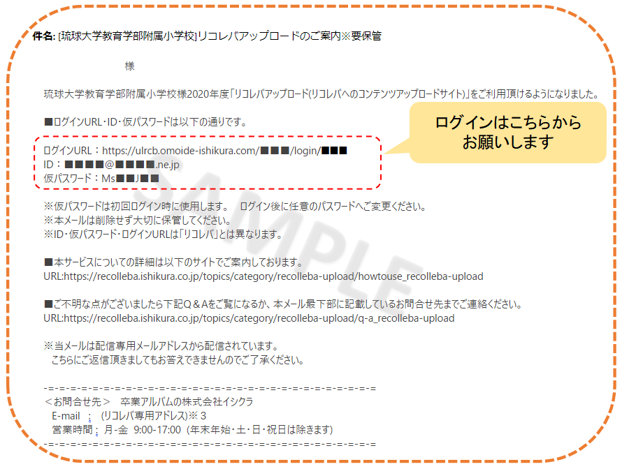 アップロード 2024.04.22 2.仮パスワードを使用して初回ログイン [STEP1] admin@omoide-ishikura.comよりお届けしたメールに記載されているログインURLにアクセスしてください <メールサンプル画面> [STEP2] リンク先より、ユーザー登録でご使用いただいたメールアドレスとメールに記載されている仮パスワードを入力してログインしてください