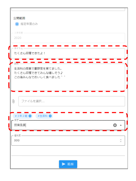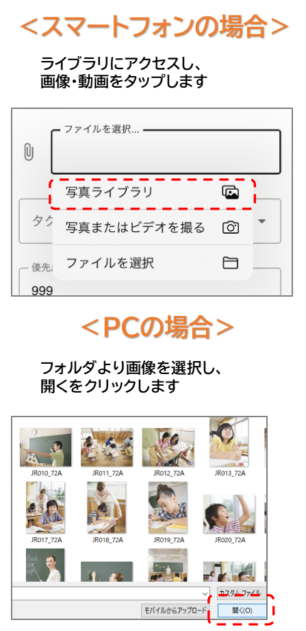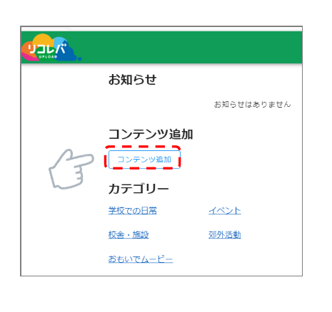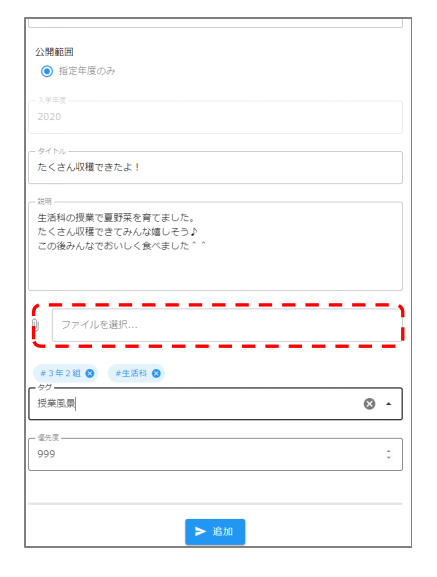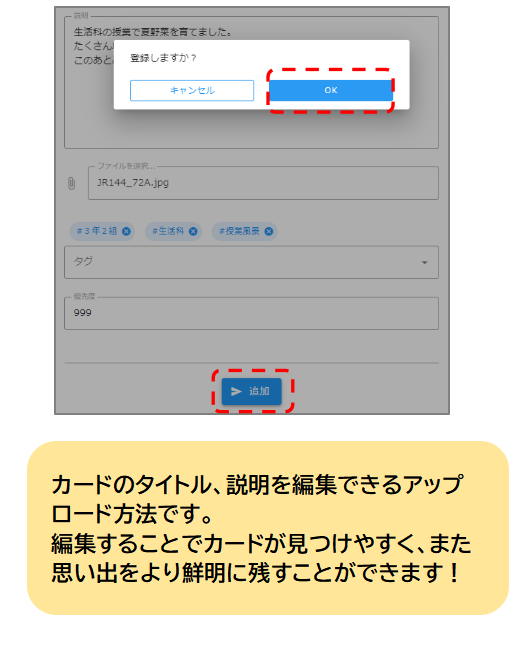 アップロード 2024.04.22 4.アップロード ◆カードにタイトルや説明をつけることができます◆ [STEP1] トップ画面のコンテンツの追加をクリックします [STEP2] カードを追加したいカテゴリとセクションを選択します [STEP3] カードのタイトル、説明、ハッシュタグを編集します(任意) [STEP4] 追加したい画像・動画を選択します [STEP5] 画面下の追加→OKボタンを押し、アップ完了です!