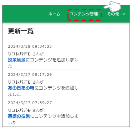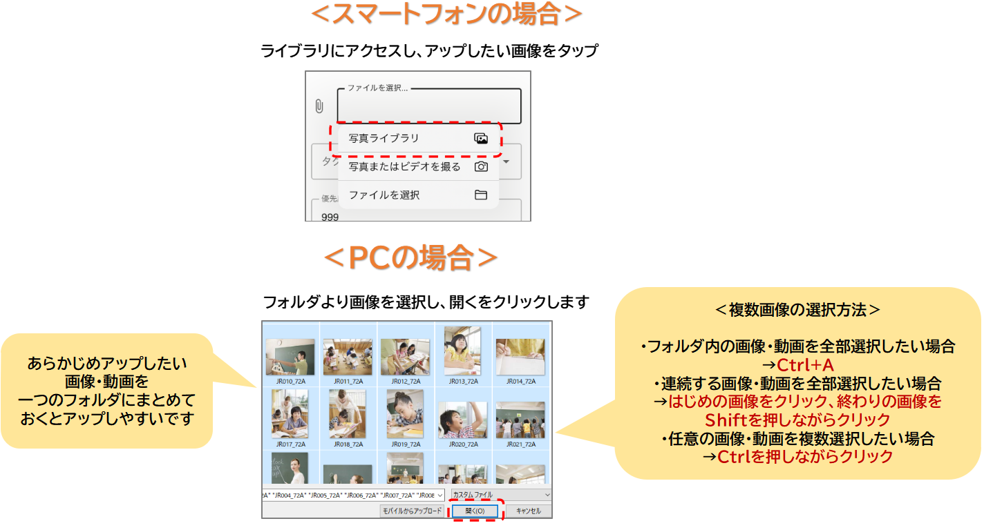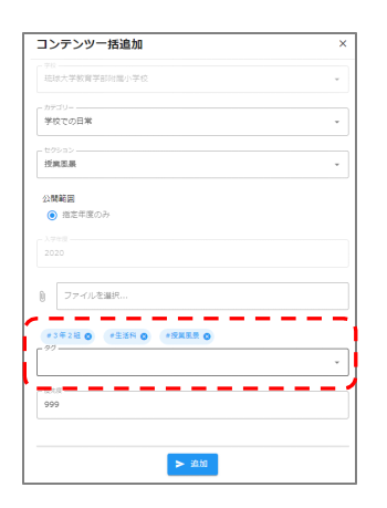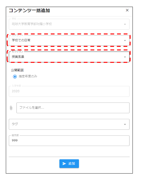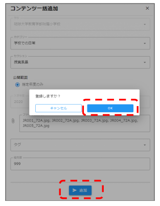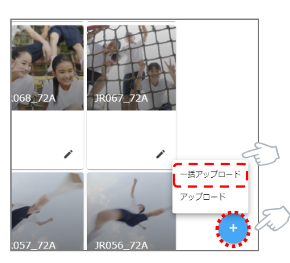 アップロード 2024.04.22 5.一括アップロード [STEP1] トップページ右上の「コンテンツ管理」をクリックします [STEP2] 右下の+マークから、一括アップロードを選択します [STEP3] 画像・動画を追加したいカテゴリとセクションを選択します [STEP4] タグを追加します(任意) [STEP5] 追加したい画像・動画を選択します [STEP6] 画面下の追加→OKボタンを押し、アップ完了です!