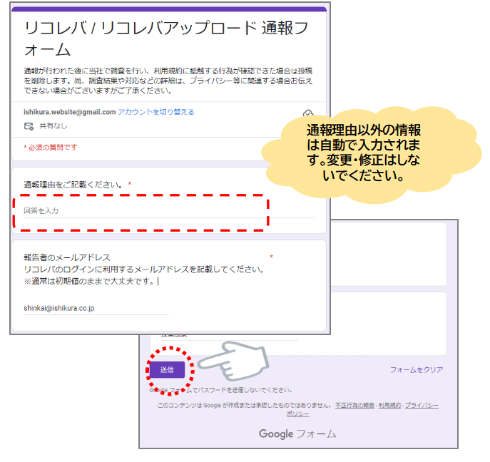 アップロード 2024.04.22 8.不適切なコンテンツの通報 不適切なコンテンツ等が投稿されていた場合は、通報機能から当社へご連絡ください 当社で通報内容を判断の上、削除等の適切な対応を行ないます [STEP1] コンテンツ詳細画面を開き、通報ボタンを押します [STEP2] 通報用フォームが開いたら、 「通報理由」を入力し、「送信」ボタンを押してください